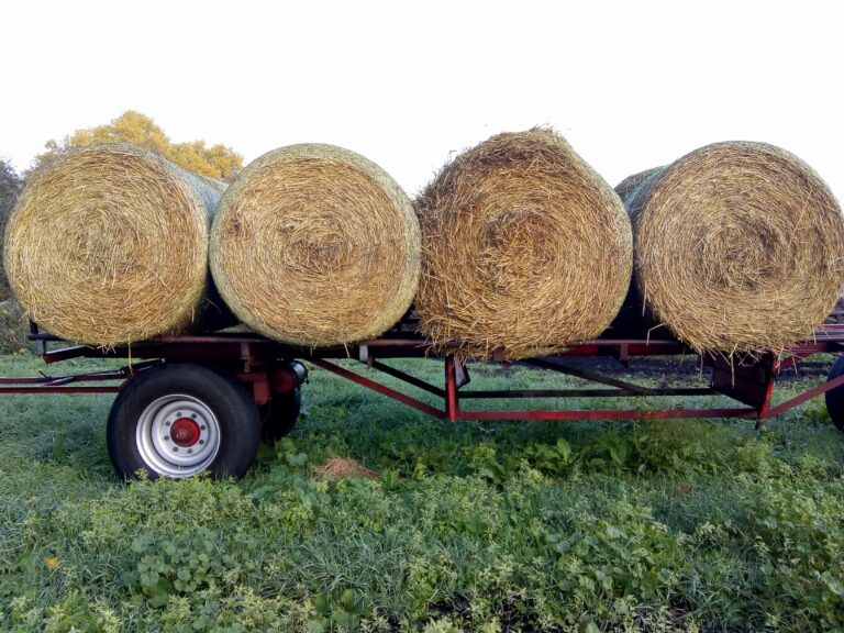 Sebastian Petri: Wir machen ganz klassisch Rundballen, also Heuballen. Die werden direkt auf der Fläche gepresst, aufgeladen und entweder gleich an die Kund*innen geliefert oder bei uns eingelagert und nach Bedarf über den Winter verkauft.