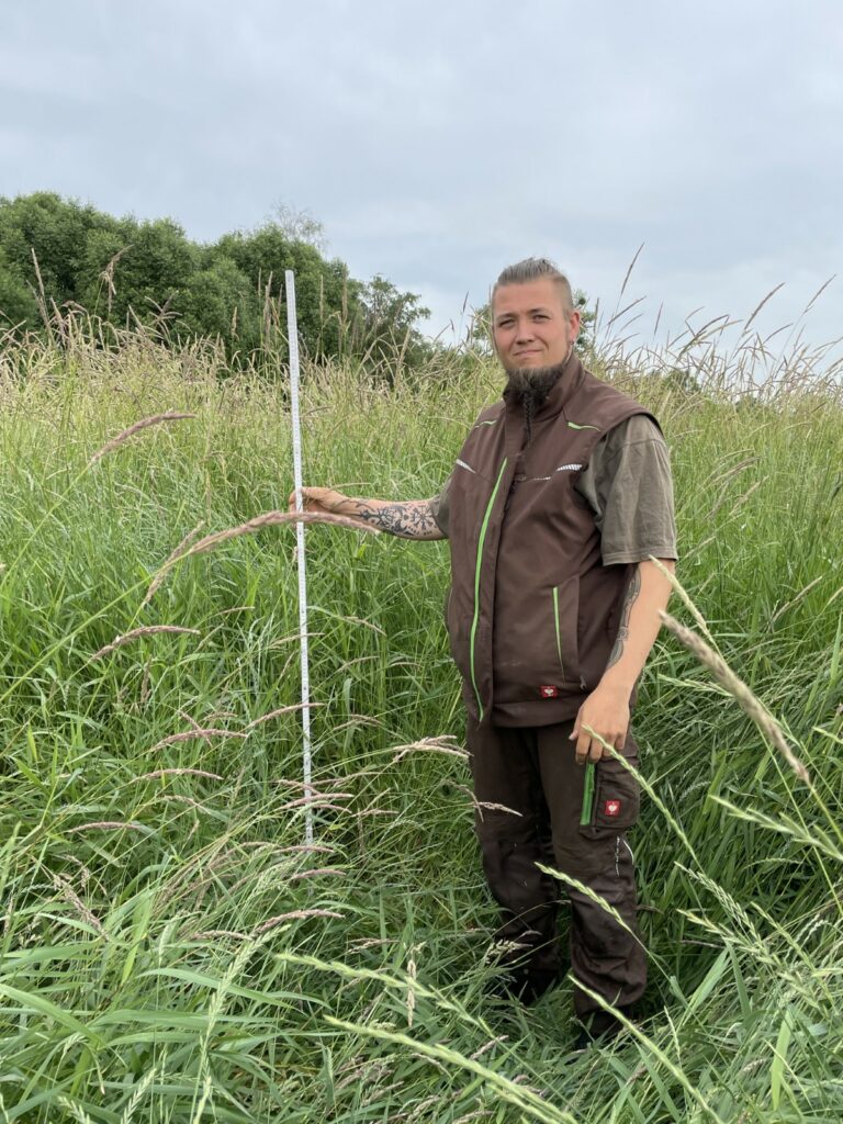 Sebastian Petri: Wir nutzen reine Feuchtwiesen, auf denen hauptsächlich Rohrglanzgras (Phalaris) und Seggen (Carex) wachsen. Diese Bestände fördern wir auch gezielt. Es ist alles natürliches Grünland – wir pflanzen also nichts aktiv an. Zum einen, weil sie auf unseren Flächen natürlich vorkommen. Und zum anderen, weil sich das Rohrglanzgras relativ gut zur Fütterung eignet. Auch die Seggen können, wenn sie gut getrocknet werden, gut von den Tieren aufgenommen werden.