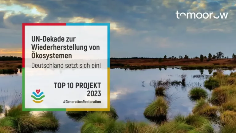 Im Rahmen des UN-Dekade-Projektwettbewerbs zeichnet das Bundesumweltministerium (BMUV) gemeinsam mit dem Bundesamt für Naturschutz (BfN) aktuelle, repräsentative Projekte zur Wiederherstellung, Erhaltung oder Pflege von Ökosystemen aus. In diesem Jahr wurde toMOORow unter den TOP 10 als herausragendes Beispiel für Moorrestauration ausgezeichnet. Gemeinsam mit unseren Projektpartnern, der Michael Succow Stiftung und dem Greifswald Moor Centrum freuen wir uns sehr über diese Anerkennung!